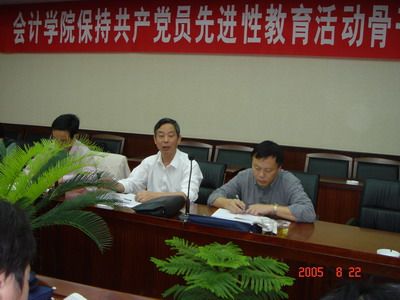 2005年8月22日—23日,会计学院党委举办为期两天的“保持党员先进性教育活动骨干培训班”,参加培训的有会计学院全体党政领导、各支部正副书记,校督导员雷银元同志也到会并做重要讲话。