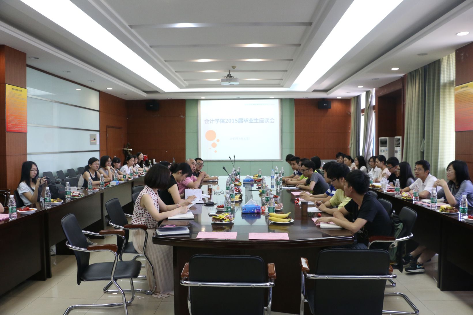 - 2015年6月12日上午9:30,会计学院两访两创系列活动之一的会计学院2015届毕业生座谈会在文泉楼南401会议室召开。参加座谈会的有会计学院张龙平院长、党委肖翠祥书记、党委王延副书记、学办刘筱彤主任、研办兼会硕中心办公室向传殿秘书、辅导员陈楠老师,以及本、硕毕业生代表,会议由王延副书记主持。