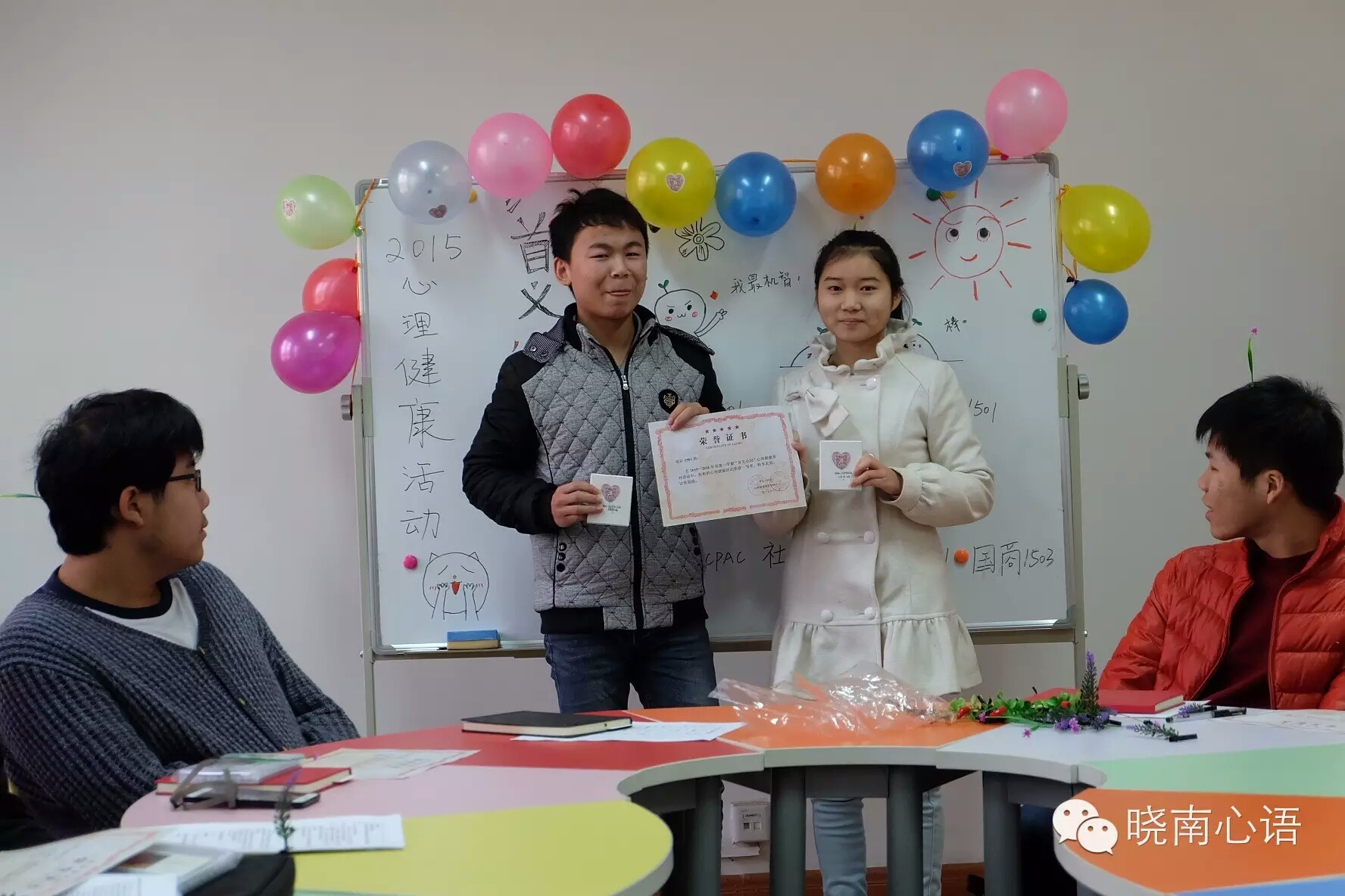 为帮助2015级新生尽快适应大学生活,提高其自身心理素质,促进身心和谐发展,学校心理健康教育咨询中心举办了2015级“首义心园”系列心理健康活动,会计学院荣获学院组织奖,多个班级获单项奖。