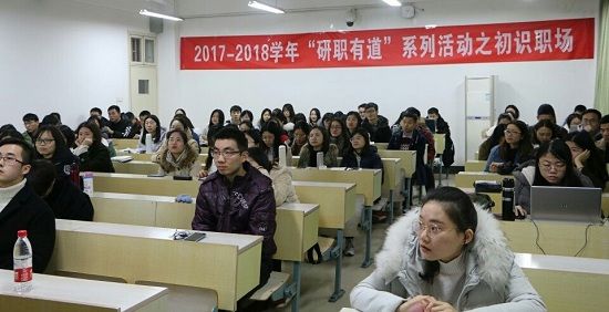 2017年12月20日晚7时,由中南财经政法大学会计学院、工商管理学院和公共管理学院三院研究生会联合主办的“研职有道”系列活动之初识职场主题讲座在文添楼102教室举行。本场讲座由公共管理学院李辉瑶、工商管理学院郑丽娇及会计学院张子铭同学主讲,共近百名研究生到场参加。