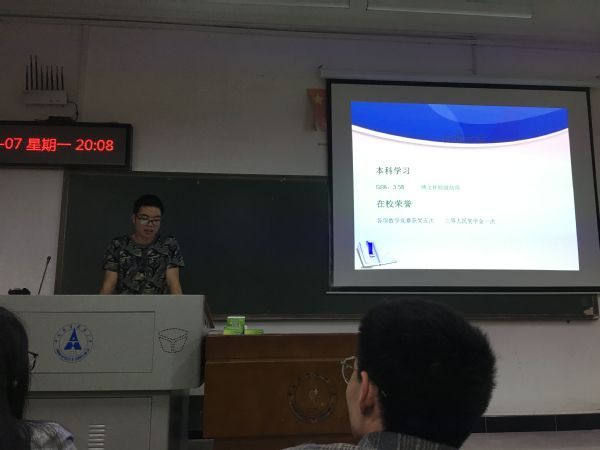 考取上海财经大学的彭吉喆师兄倾心向在座同学传授了他的考研心得。他向大家介绍了学硕、专硕考研的区别,并就类别选择、各科如何复习等问题给出了他的建议。更重要的是,他还向同学们传授了自己的复试技巧,告诫大家注重专业知识积累,面试中要保持自信大方。