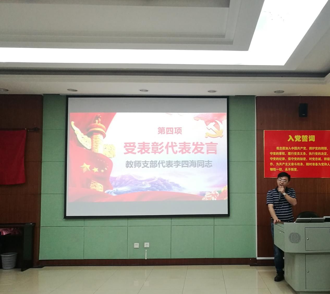 在发言环节,财务管理支部书记李四海、行政支部书记王芹和2016级支部孙蕊分别作为教师支部代表、党务工作者代表和学生党员代表进行了发言,分别从“一体两翼”工作原则、党务工作实际体会和“不负时代 不负芳华”等内容阐释了作为一名党员对自己岗位的思考。