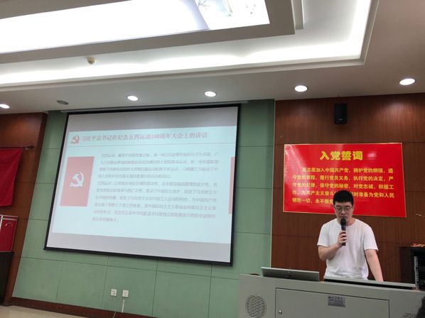 会议第六部分为微党课学习。首先,由吴佳琪同志分享其对五四百年习近平总书记重要讲话精神的理解,让同志们更加清楚地理解“树立远大理想”等六个方面的具体含义。之后,李土娇同志对新中国成立以来外交方面70年的发展历史进行简要回顾,引用外交部长王毅对70年外交历史的总结,让同志们对70年的外交史有更清晰的认识。