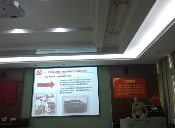 在重温入党誓词、现场交纳党费、诵读党章之后,集中学习了《习近平总书记在全国教育大会上的讲话精神》,接下来由陈楠同志带领大家深入学习习近平关于扶贫工作的重要论述,重点学习了《习近平扶贫论述摘编》第一章《决胜脱贫攻坚共享全面小康》,她梳理了论述摘编中关于贫困与社会主义的关系,让大家了解了扶贫的历史、当下与展望,解释了精准脱贫攻坚对实现小康社会目标的重要性。