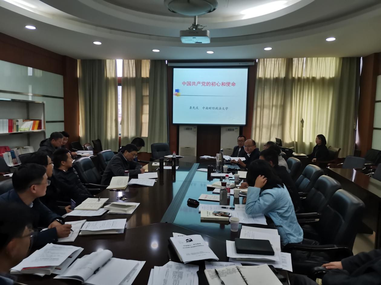 本次理论学习会上,学院特邀马克思主义学院院长龚先庆教授做了“中国共产党的初心使命”专题报告。他从“千年第一思想家”、“伟大的社会革命”、“以苏为鉴”和“伟大的自我革命”四个角度,生动地、多维度地诠释了中国共产党人的初心和使命——为中国人民谋幸福,为中华民族谋复兴。他认为,我们要居安思危,铭记历史,以苏为鉴,在奋力实现中华民族伟大复兴中国梦的路上,坚持以人民为中心,走出一片艳阳天。