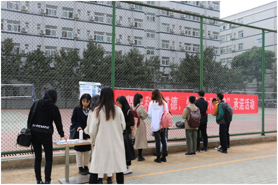 21日中午,学院在十食堂举办“我承诺”签名活动,同学们在活动现场认真观看宣传海报,听取现场工作人员讲解,了解学术规范与科研道德的相关知识,并在印有“坚守科学道德,恪守学术诚信”的横幅上签字。