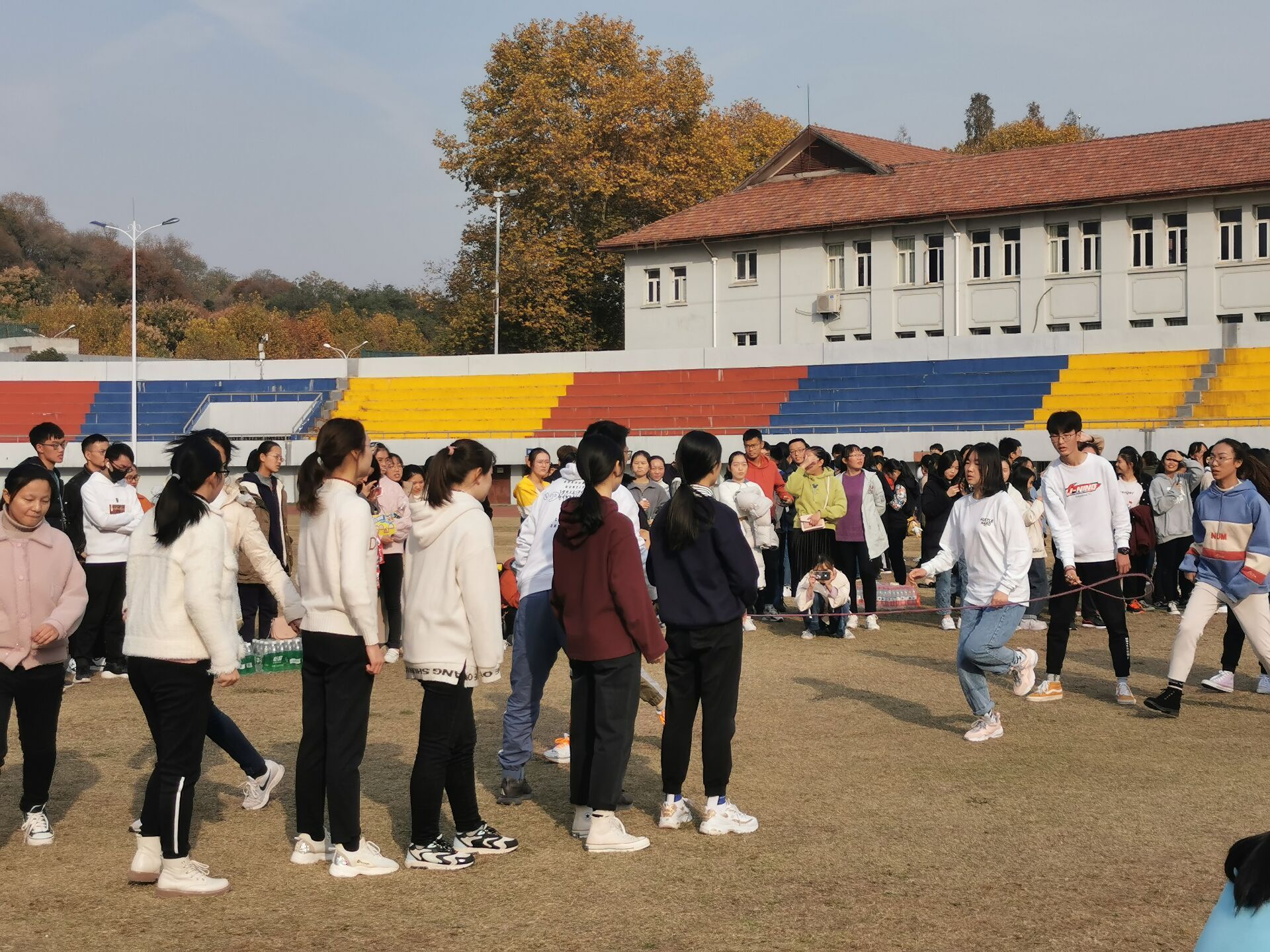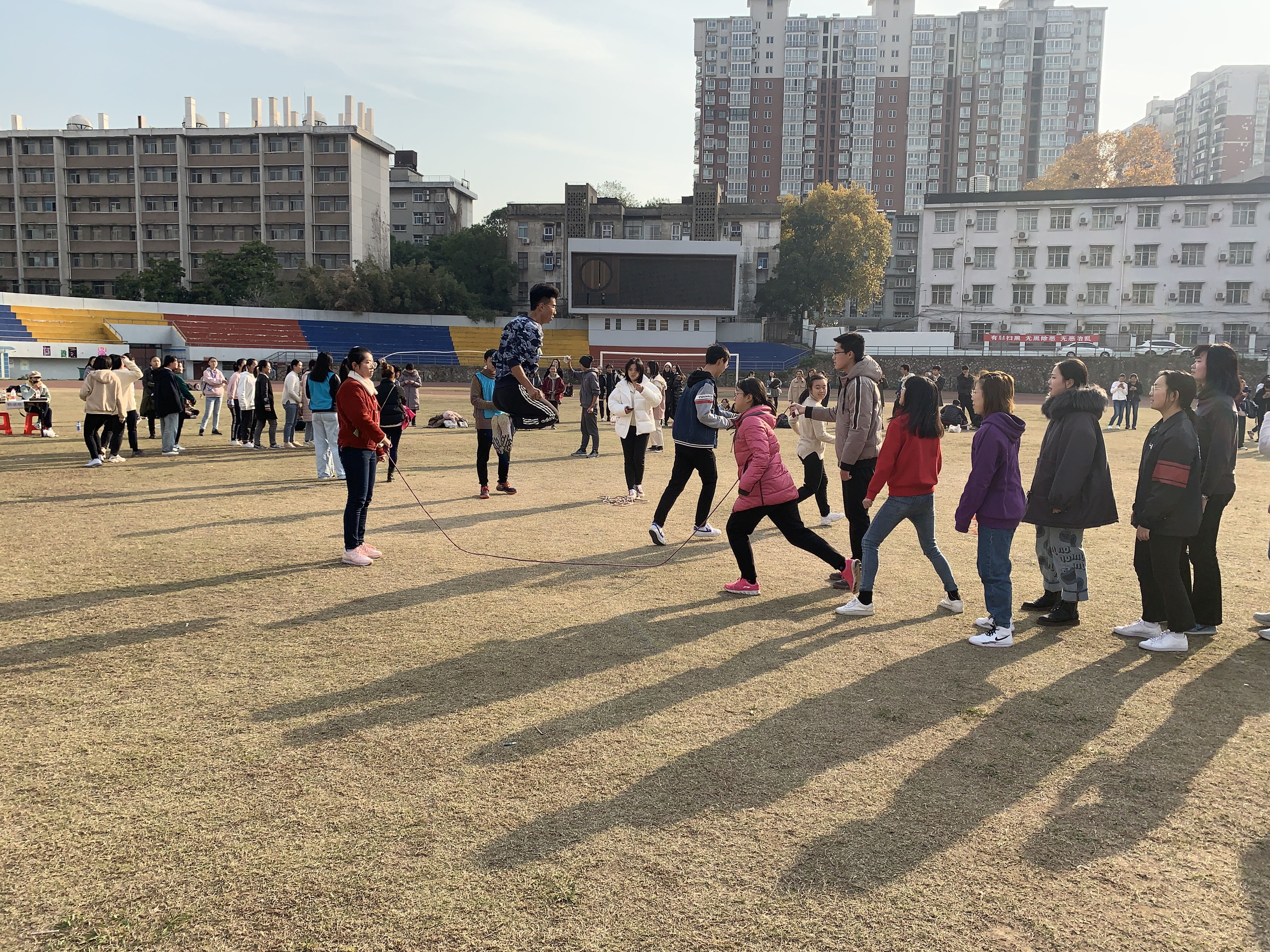 本次运动会,旨在营造趣味横生的氛围,分别设立了“爱的魔力转圈圈”、“跳长绳”、“诺亚方舟”和“拔河”四项团体项目。冬日的下午,阳光正好,虽则时有冷风相伴,但会院学子的热情却分毫不减,每一项项目都融汇着所有人的全力付出,每一个角落,都伴随着每个人的爽朗笑声。
