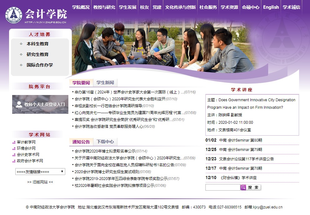 全新亮相的会计学院网站从整体架构、功能模块、用户体验等方面做了全方位升级,改版后的网站内容更加丰富、结构更加清晰。在布局上,首页设有7大详情版块及12大导航栏目,各版块功能明确、内容丰富,方便您快捷获取想了解的信息;在设计上,网站采用全新的视觉风格,为您提供更佳的视觉和浏览感受。