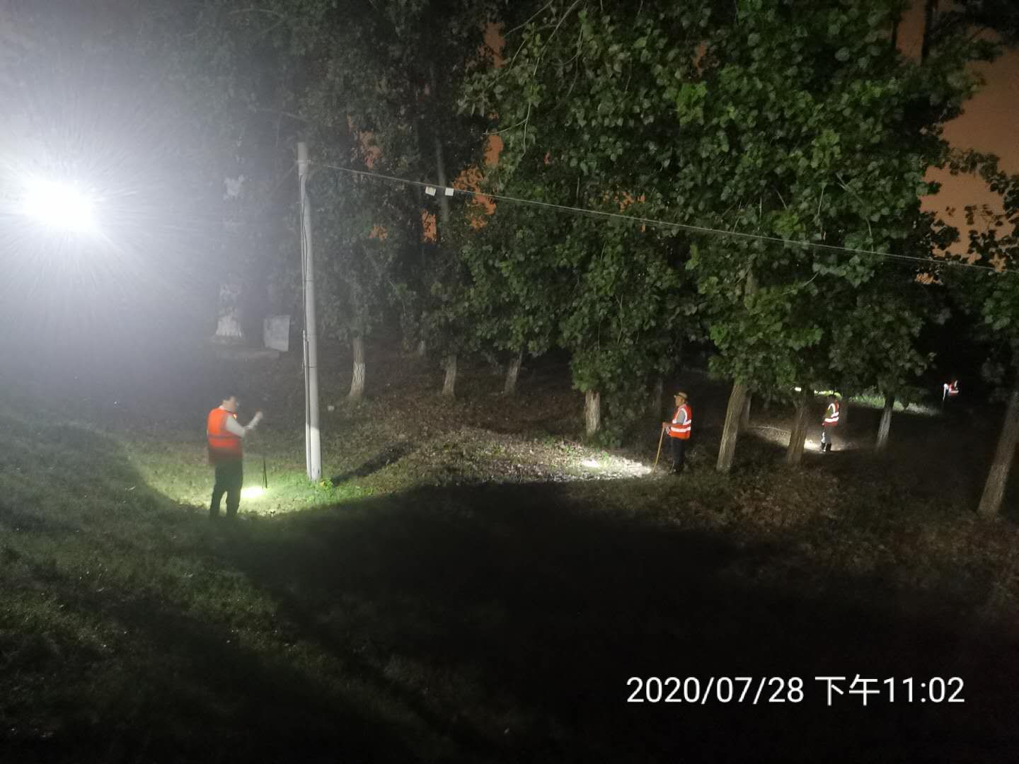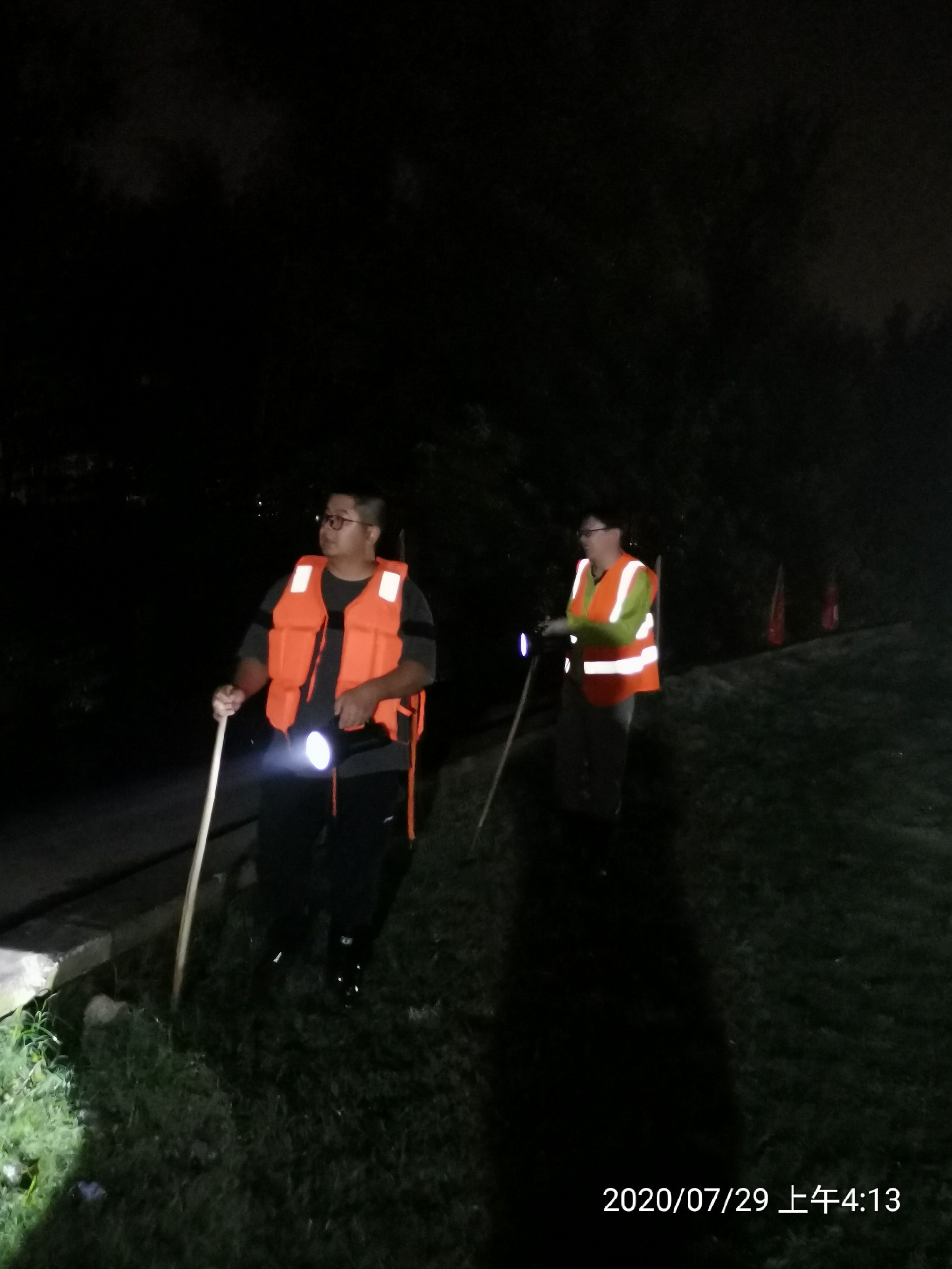 防汛队员分组轮换,24小时不间断巡堤查险,全力以赴,不畏艰苦。