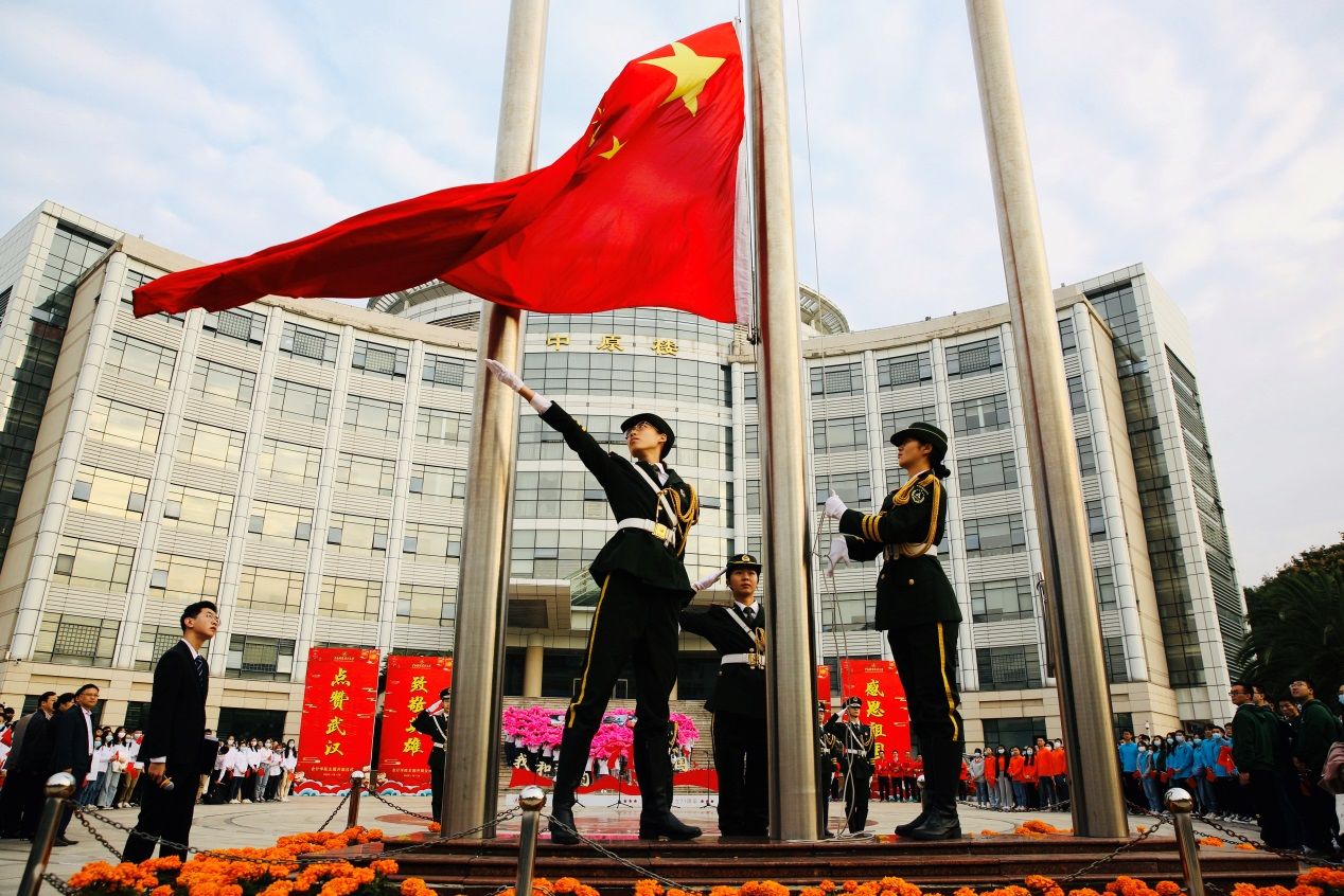 万众一心,同舟共济;闻令而动,雷厉风行”;“雷神山,火神山,钟南山,山山镇妖;医者心,仁者心,中国心,一心抗疫”饱含深情、抑扬顿挫的朗诵将主题升旗活动推向了高潮。为每一个武汉人点赞,向每一个中国人致敬,用每一个身影,书写我们的传奇。会院学子手中挥动着的小国旗与旗杆上的大国旗相映生辉,构成了中南大清晨一抹美丽的风景。
