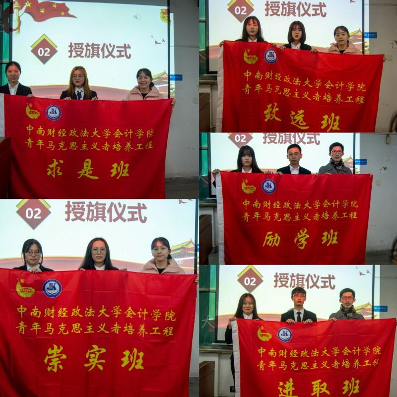 大会主要包括七项内容。第一项,奏唱共青团团歌。接下来会计学院团委书记张昭妍老师、副书记陈俊华老师分别为第十四期青马班“求是班”“崇实班”“致远班”“励学班”“进取班”授旗。