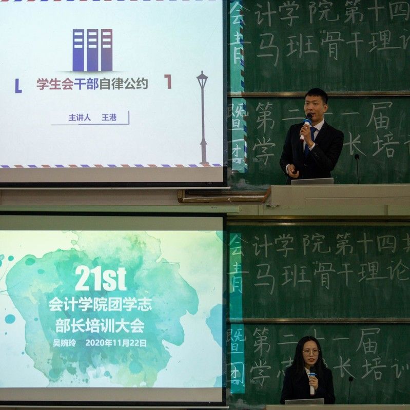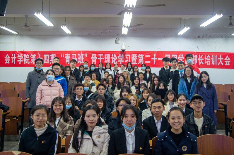 2020年11月22日下午两点半,会计学院第十四期“青马班”骨干理论学习暨第二十一届团学志部长培训大会在文澜楼210召开。本次大会的主要目的是学习十九届五中全会精神,进一步提升我院团学骨干理论水平和业务素养,推动全会精神在学生中入脑入心,落地生根,并将其自觉运用到日常工作学习中,成为新时期马克思主义的优秀传播者。会计学院团委书记张昭妍老师、副书记陈俊华老师参加了此次活动。
