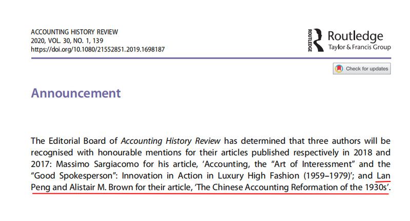 《Accounting History Review》在2020年第1期官宣彭岚副教授的获奖信息