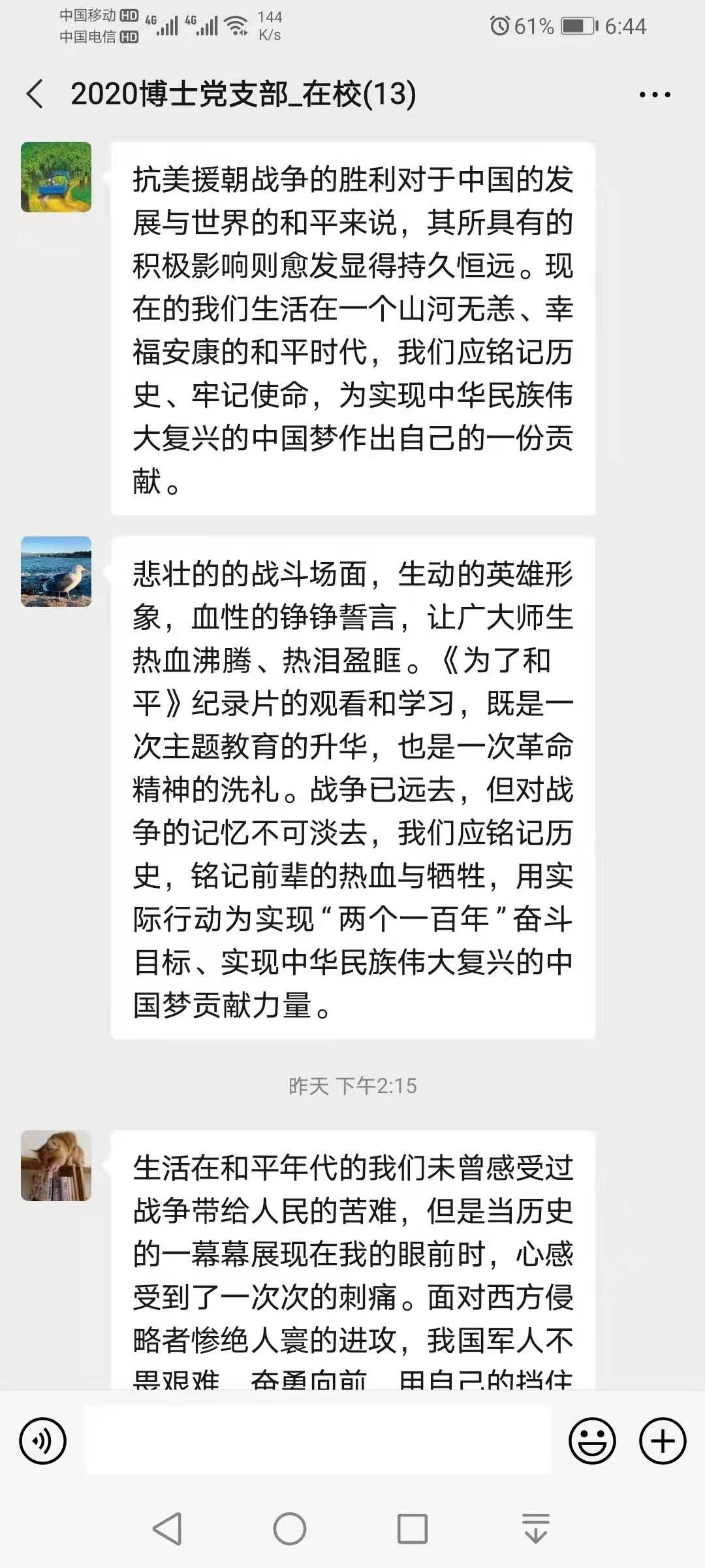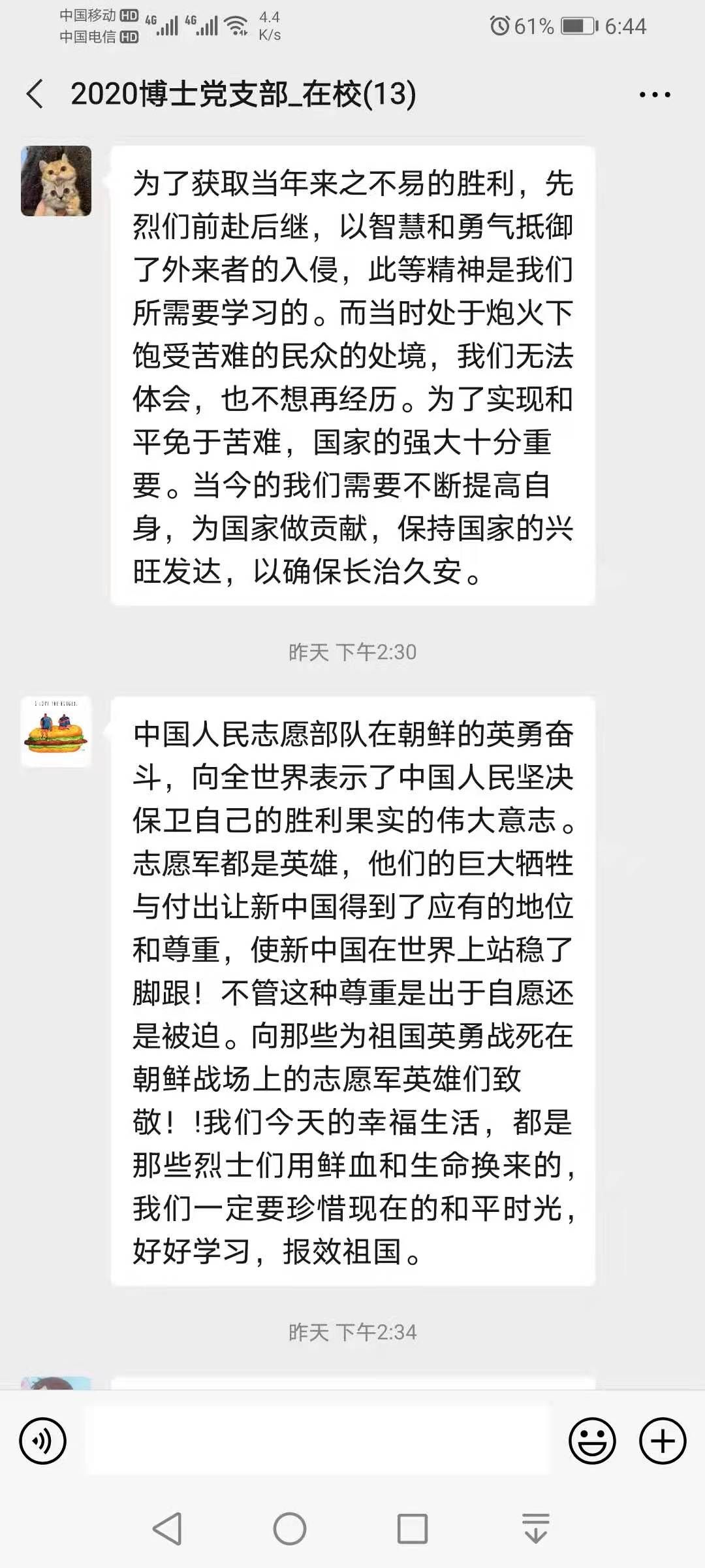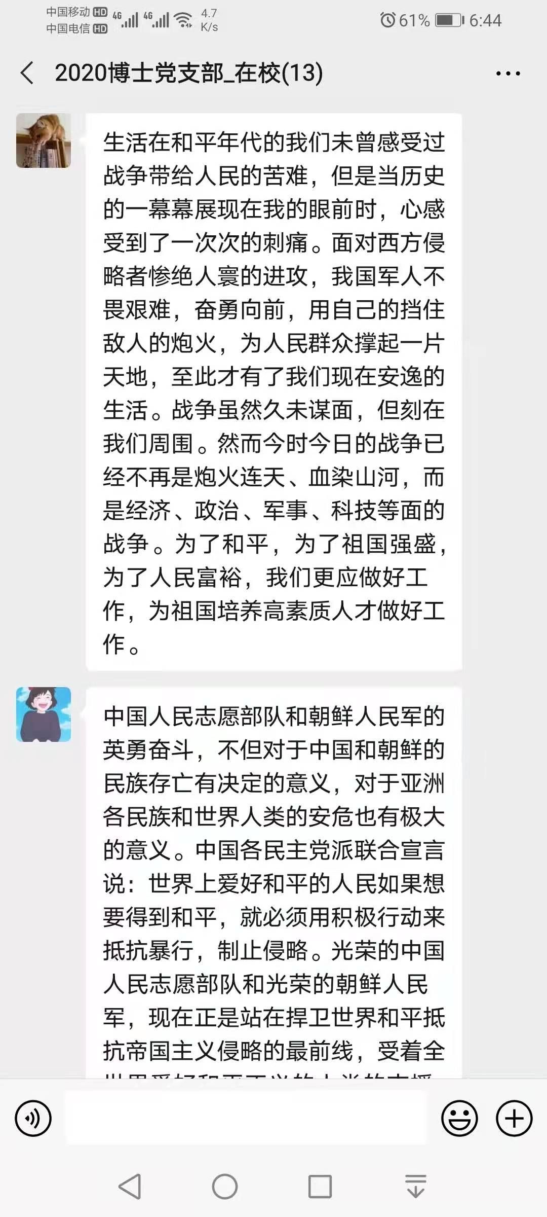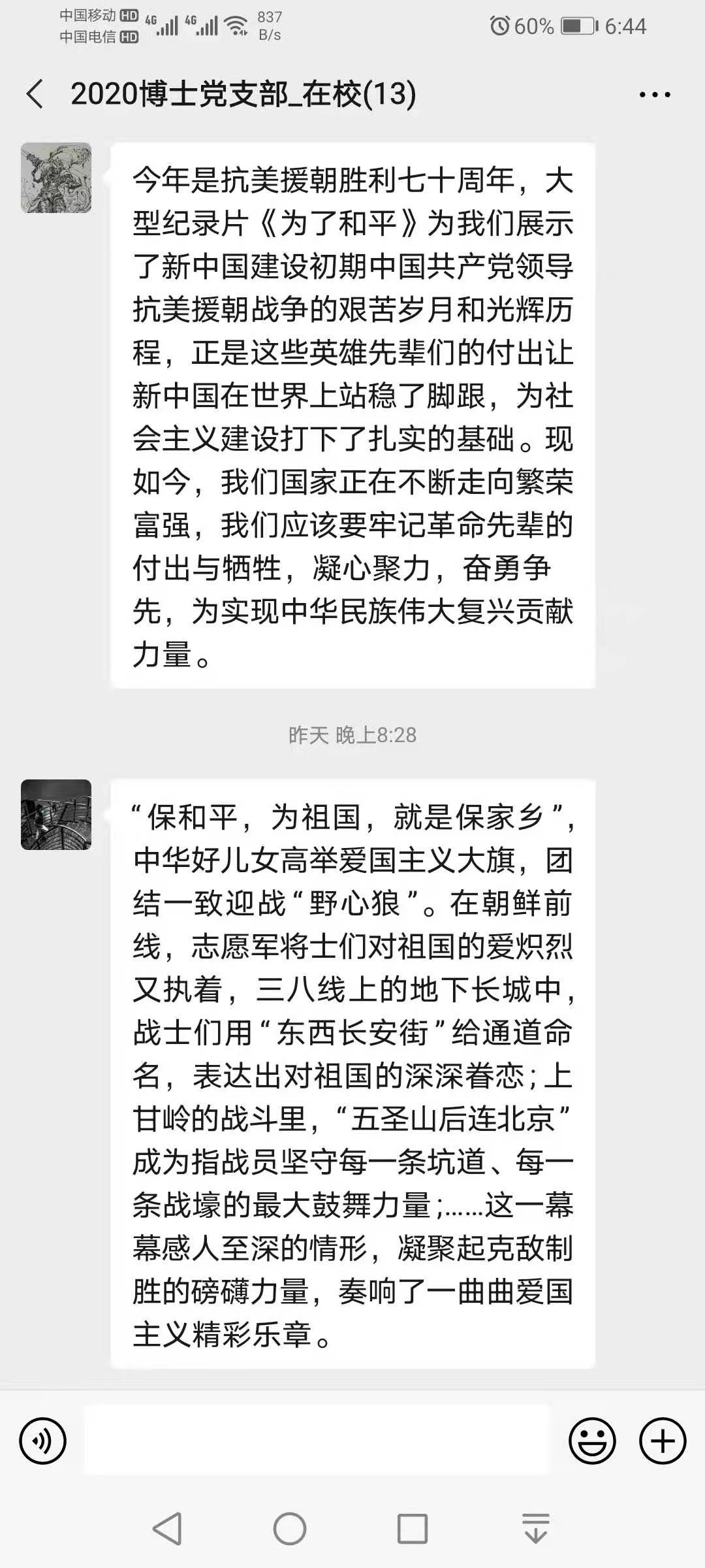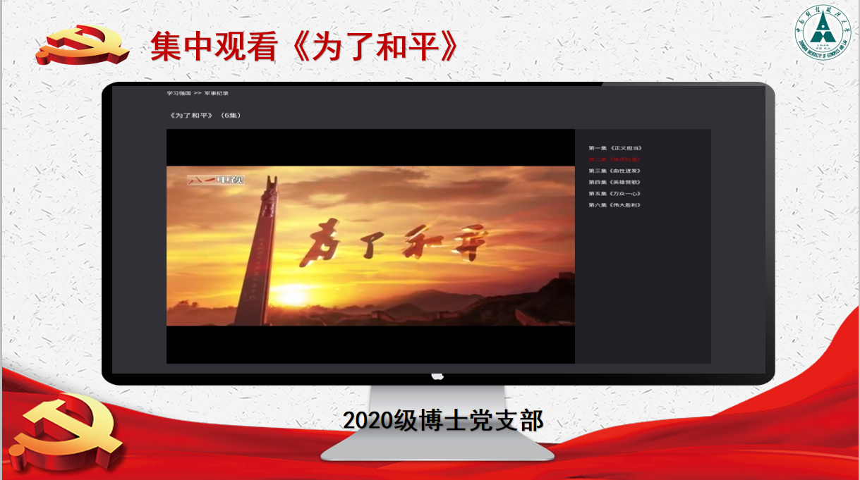 (通讯员 康艺) 2020年12月23日,通过集中观看《为了和平》纪录片以及自主学习后,2020级博士党支部全体党员就此次的活动体会进行了积极发言。此次活动是贯彻落实习近平总书记在纪念中国人民志愿军抗美援朝出国作战 70 周年大会上的重要讲话精神的具体举措。