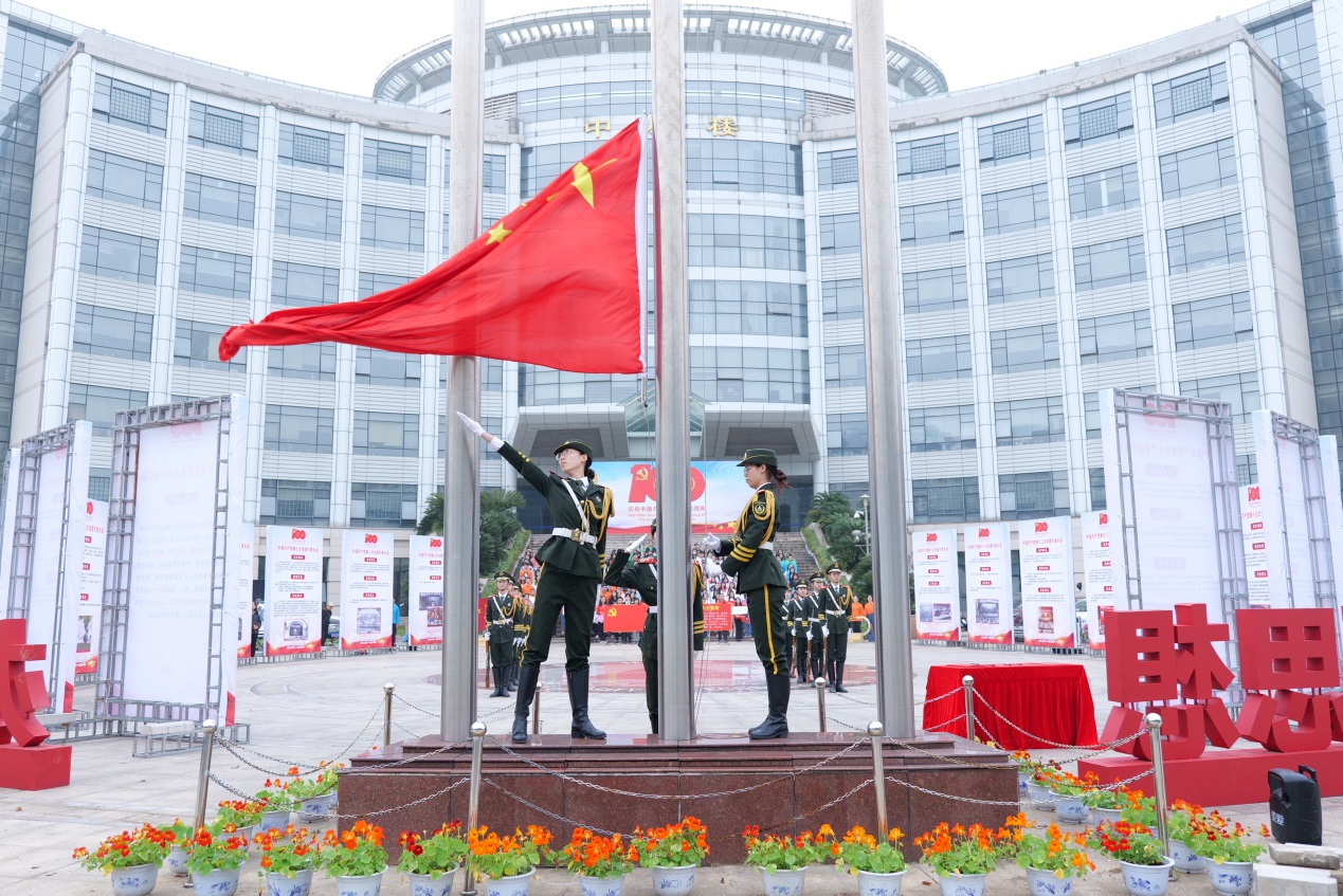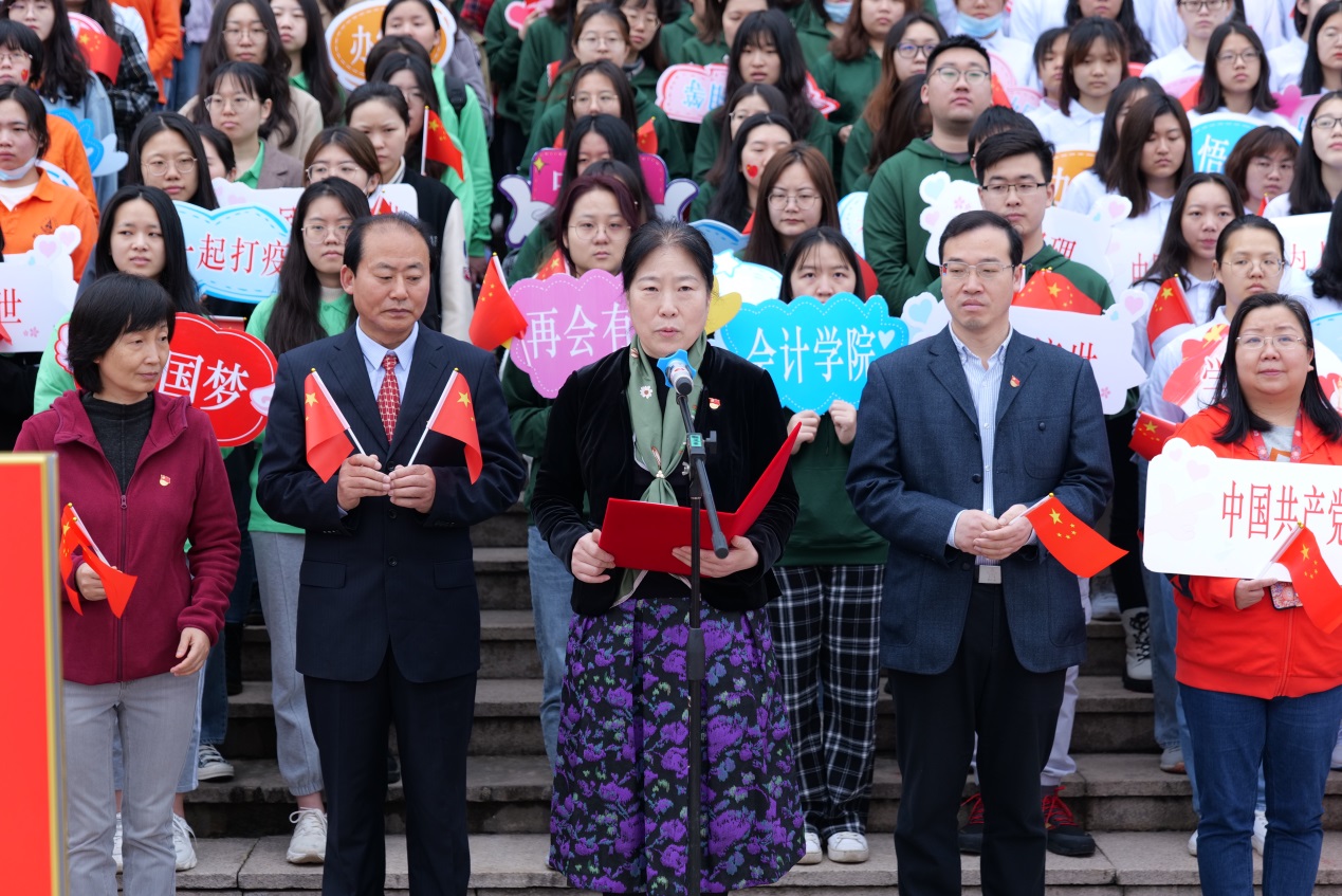 20块百年党史文化知识展板在中原楼广场巍然耸立,壮观雄伟,波澜壮阔。上午七时三分,国旗护卫队迈着坚毅的步伐,伴着铿锵的口号,越过青云桥,将鲜艳的五星红旗护送到中原楼广场,伴随着国歌声冉冉升起。校党委常委、副校长姚莉教授宣布会计学院“学党史·悟思想·办实事·开新局”主题升旗活动暨党史文化知识展开幕。活动第一项,会计学院党委书记殷修林带领同志们重温入党誓词,“为共产主义奋斗终身”的誓言牢记心中,响彻耳畔,庄严神圣。