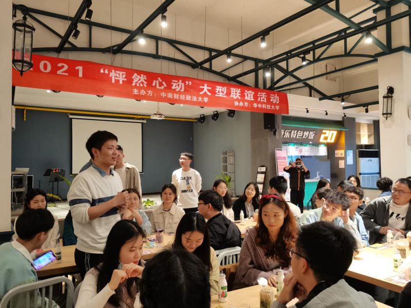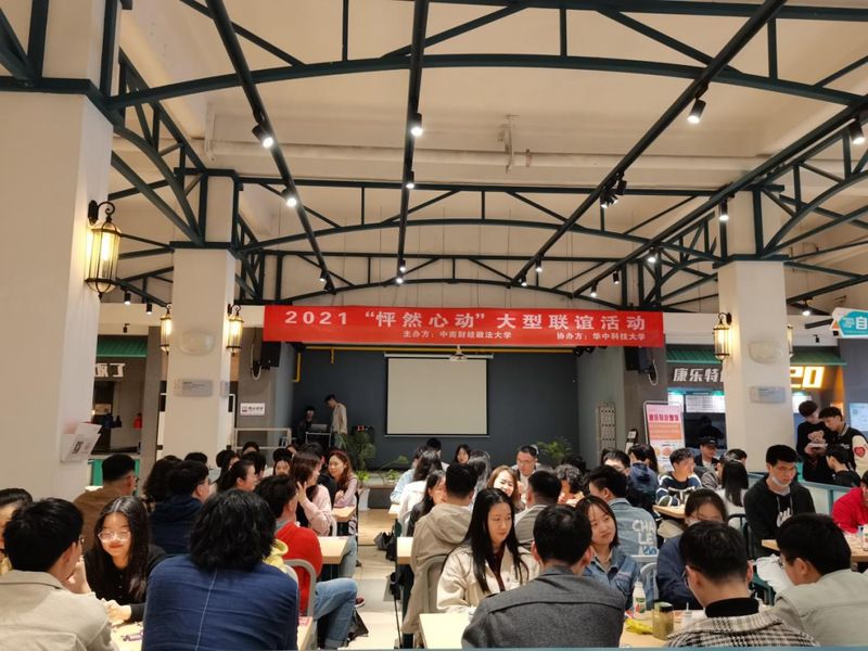 2021年4月24日下午2:30-5:00,由中南财经政法大学会计学院研究生会与华中科技大学人工智能与自动化学院研究生会共同举办的“怦然心动”联谊活动在中南财经政法大学五食堂快乐食间顺利举行。本次活动旨在让同学们有机会认识和结交更多优秀的朋友,促进校际文化沟通交流以及丰富研究生的业余生活。