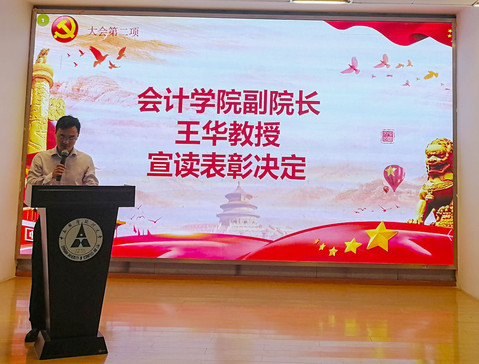 大会第二项,会计学院副院长王华教授宣读表彰决定。学院表彰内容包括院优秀学生干部、院优秀共青团员、院优秀志愿者,以及在英语六级考试中前十名的学生颁发学院专项奖励。同时,学院还对获得国际班奖学金的同学进行专门表彰。