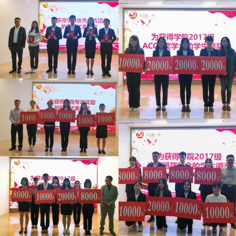 大会第三项,颁奖仪式。伴随着热烈的掌声,学院领导为获奖学生代表颁发奖状、奖金并合影留念。获奖者通过自己优异突出的学习工作表现,不仅在受表彰中肯定了自我,还为同学们展现了丰富的大学生活,发挥了榜样的力量。加拿大特许专业会计师协会国际部教育项目主任Isaac KO致辞,他大力赞扬了2017级CPAC方向班的获奖同学们,并对所有同学接下来的学习寄予了殷切的期望。