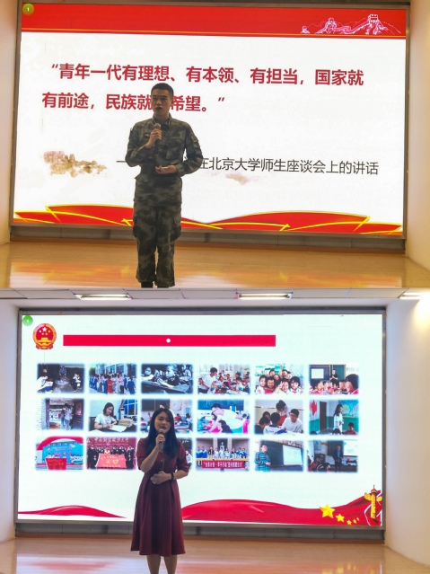 大会第四项,受表彰代表宣讲。首先是本科生代表会基1801张煜,他宣讲的题目是《我的军旅故事》。他从参军生活展开,讲述了他对参军时光的经历以及领悟,激励同学做有理想有担当的中国青年。研究生代表、19级会计学研究生谢莹莹宣讲的主题是《教育扶贫,托举百年希望》。谢莹莹通过自身在恩施参加研究生支教团支教的经历告诉大家,教育扶贫就是最精准的扶贫。两位表彰代表的宣讲慷慨有力,激励着在场的学子们以更饱满的热情投入到党和国家的建设中。