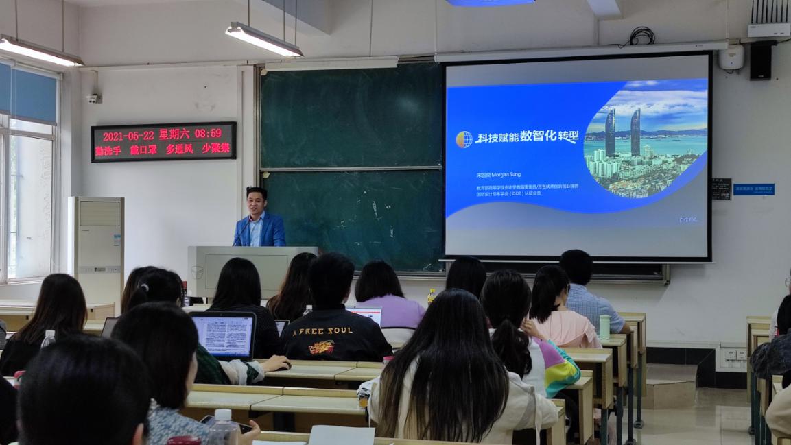 2021年5月22日上午,会计学院(会硕中心)邀请教育部高等学校会计学专业教学指导委员会委员,教育部万名优秀创新创业导师宋国荣先生在文添楼112教室为学院(中心)专业硕士做《科技赋能数智化转型:智能会计专业改革探索与实践》主题报告。报告由会计学院硕士研究生导师陈峻副教授主持。