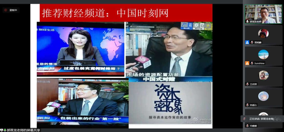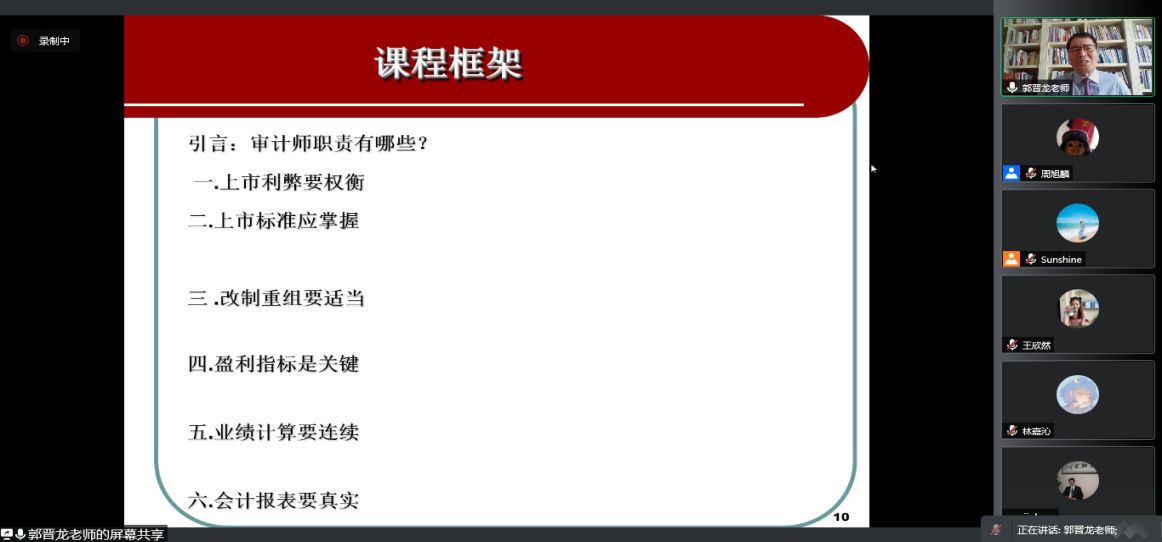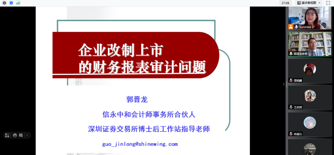 2021年6月18日,信永中和会计师事务所合伙人郭晋龙先生应我院陈丽红教授邀请,通过腾讯会议与我院专业硕士在“云端”面对面,开展了主题为“企业改制上市中的财务报表审计问题”的课程讲授。郭晋龙先生现任信永中和会计师事务所合伙人,是我国注册会计师、澳洲注册会计师资深会员、ACCA中国专家智库成员、中国会计学会“企业会计准则委员会”副主任委员。自1988年8月以来,郭晋龙先生一直深耕于注册会计师行业,期间主持过多家大型国有企业改制规划和上市审计业务,参与了中国注册会计师独立审计准则的制定,出版了《注册会计师合伙人纠纷案例分析》等10余部专著,并在《中国注册会计师》等知名刊物上发表专业文章60余篇。本次讲座由我院专硕导师组组长陈丽红教授主持,我院研究生在课程期间多次与郭晋龙先生精彩互动,表现出我院学子强烈的求知欲和饱满的精神面貌。