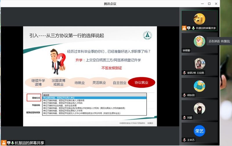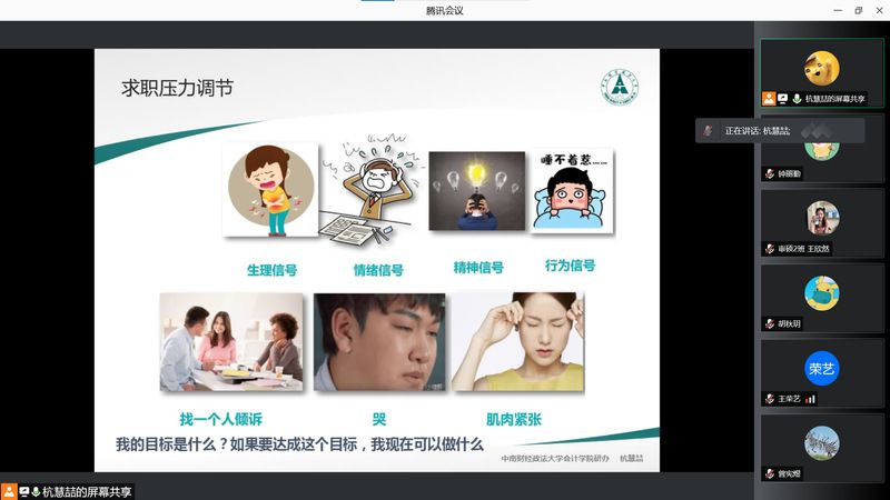 8月9日晚7点,会计学院(会硕中心)通过腾讯会议线上平台,面向2020级审计专业硕士开展求职就业专题培训。辅导员杭慧喆从档案与档案的去向、三方协议签订与违约、公务员与选调生、招聘信息获取、简历及简历筛选、面试注意点、求职压力调节、就业大数据及时间表等多个方面对学生开展专题辅导,引导同学们强化思想认识、转变就业观念、储备专业知识技能,赢在求职“起跑线”,实现自己的人生价值。