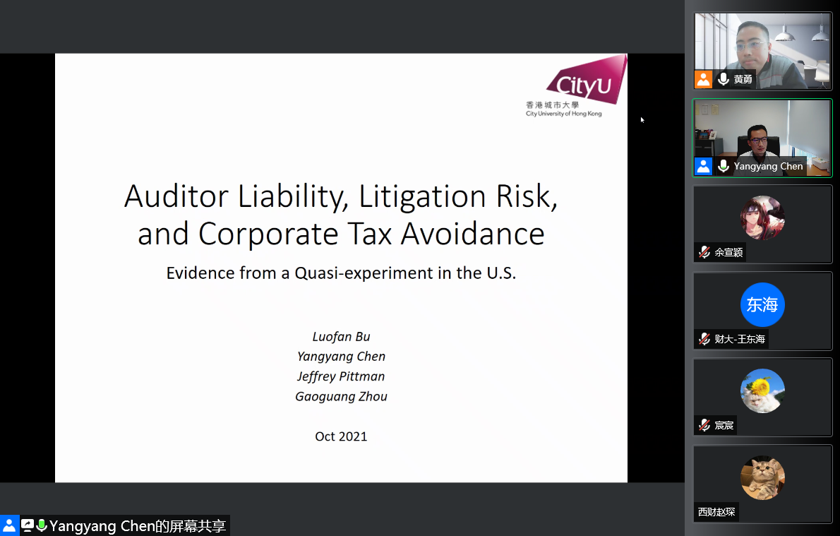 2021年10月21日,“中南·会计Seminar”第103期在腾讯会议线上成功举行。香港城市大学陈旸旸教授应邀为我院师生作了题为《Auditor Liability, Litigation Risk, and Corporate Tax Avoidance: Evidence from a Quasi-Experiment in the U.S》的学术报告。