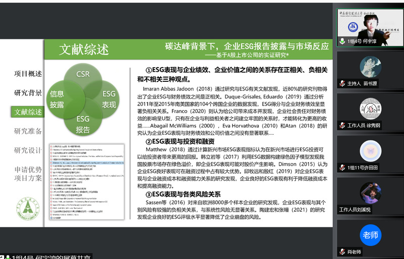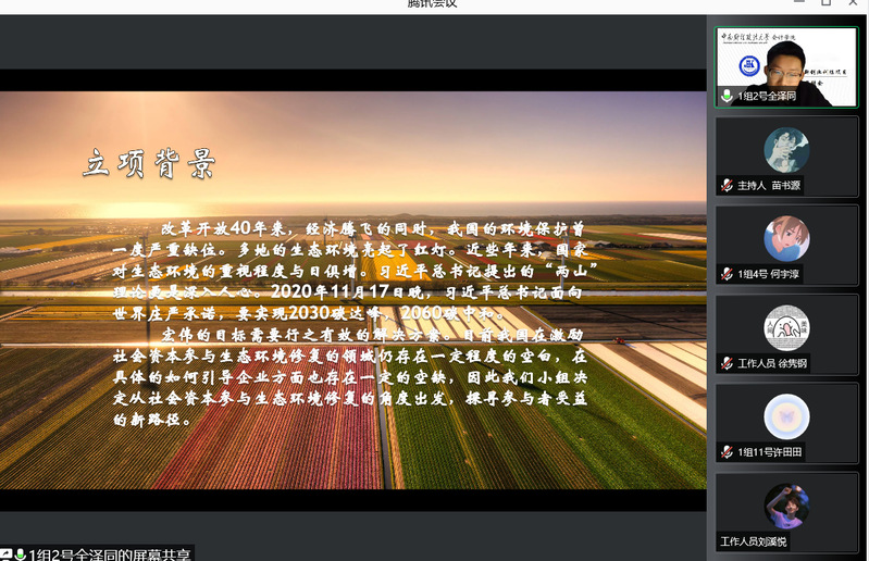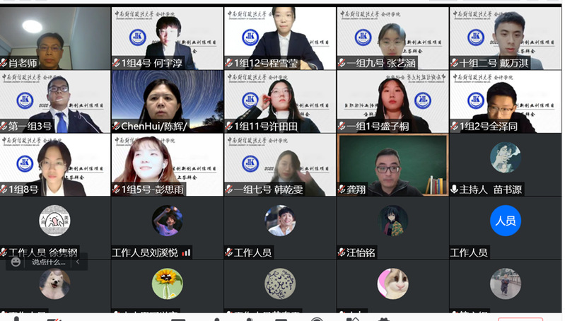 本次答辩会共有35个项目参与申报,分为三个小组在腾讯会议同时进行答辩。在主持人介绍答辩专家与答辩规则后,各项目代表按抽签次序依次展示。同学们准备充分,围绕着项目背景、研究思路与方法、研究内容及发现、成果展示等多个方面展开具体答辩。答辩项目题材涉猎广泛,论述方式丰富多样,答辩代表的演讲内容不仅包含其专业学科知识,还紧密结合当前时事新闻,将专业知识具体运用到社会实践中,运用多种概念模型,全方位向评审老师展示了会计学子应有的素质风采和创新能力。