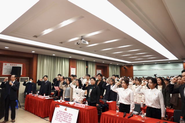 授课开始前,首批湖北省高校优秀“双带头人”教师党支部书记、会计学院汤湘希教授带领在场师生党员重温入党誓词。
