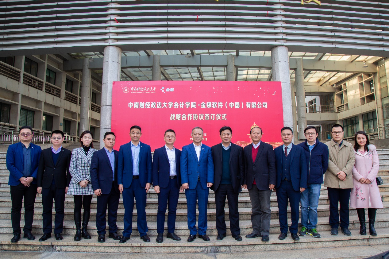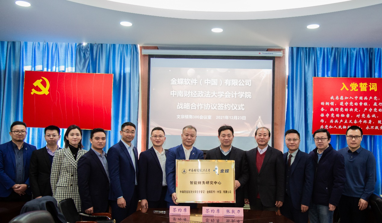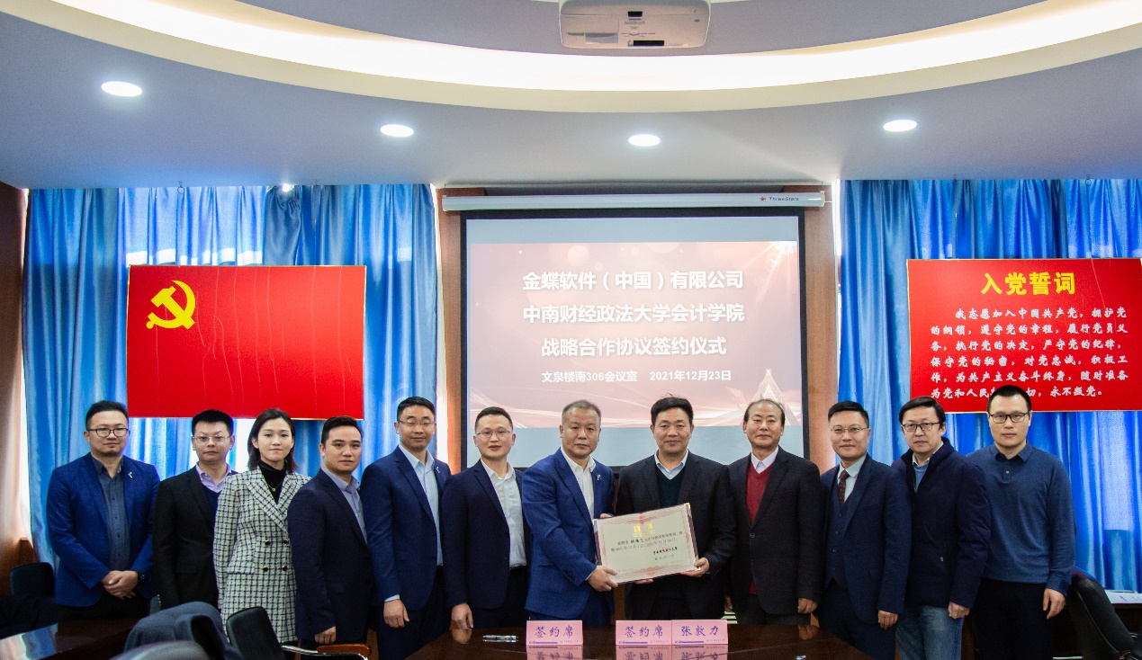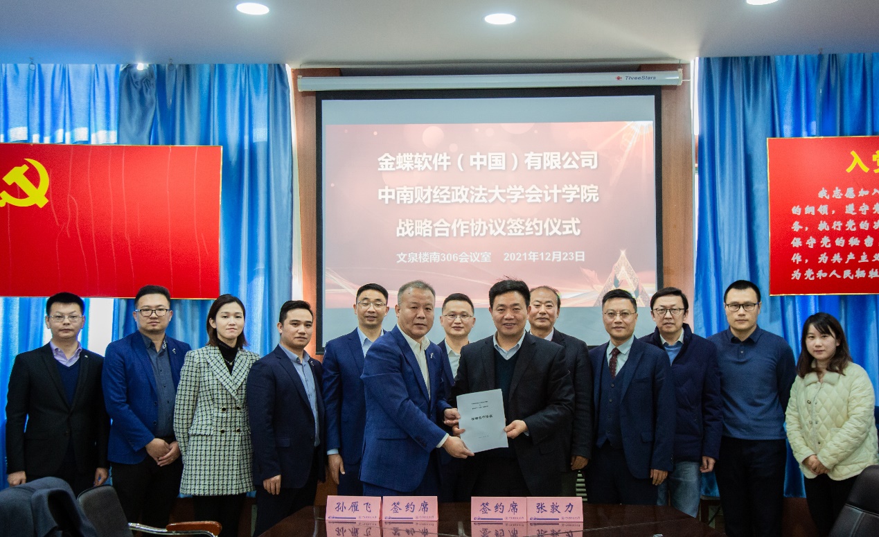 (通讯员:赵侃 王雪颖)2021年12月23日上午,中南财经政法大学会计学院与金蝶软件(中国)有限公司战略合作协议签订仪式在文泉楼南306会议室举行。金蝶软件(中国)有限公司高级副总裁、战略发展部总经理孙雁飞,金蝶精一信息科技服务有限公司总经理陈跃,金蝶软件湖北省公司总经理陈慧蛟,金蝶精一鄂黔区总监莫才龙、高级客户经理陈震,金蝶软件市场部总监高金,金蝶精一客户成功部总监柯淦莅临我校,会计学院院长张敦力,党委书记殷修林,党委副书记、纪委书记兼行政副院长徐会超,副院长冉明东,党委副书记胡桂锬等出席了仪式。会议由殷修林主持。