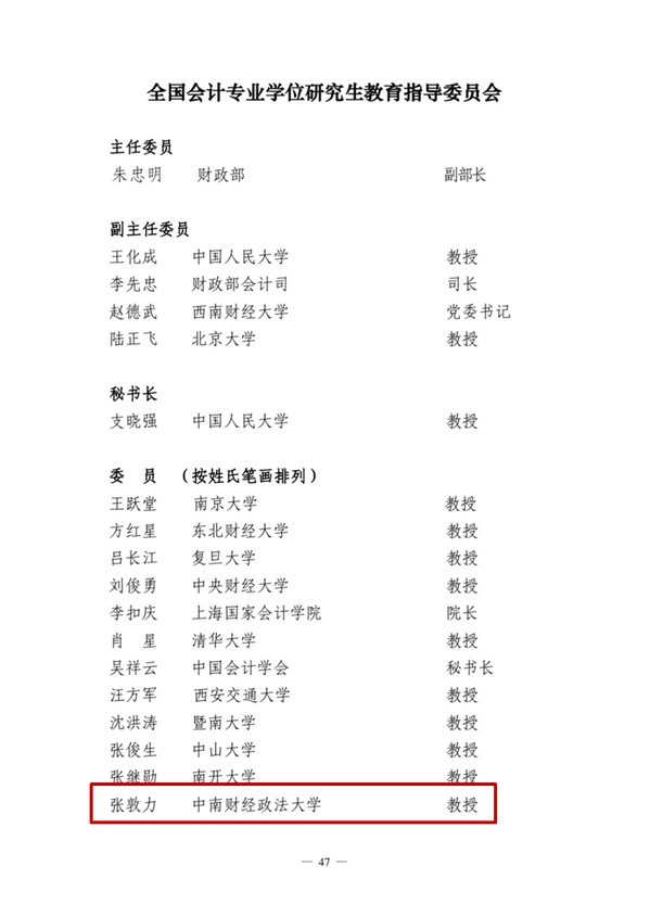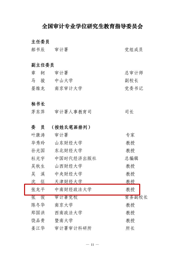 张龙平教授、张敦力教授分别入选国务院学位委员会、教育部、人力资源和社会保障部全国专业学位研究生新一届审计教指委和会计教指委。