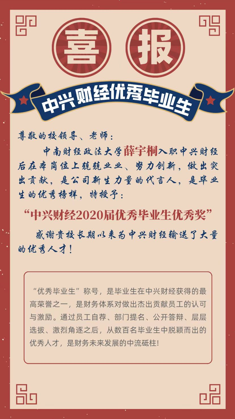 专硕毕业生薛宇桐获评中兴财经“2020届优秀毕业生”。
