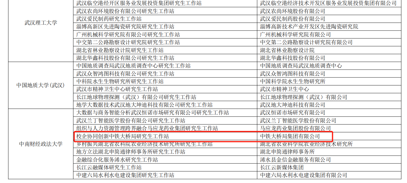 与中铁大桥局集团有限公司合作建设的“校企协同创新中铁大桥局研究生工作站”获批湖北省研究生工作站。