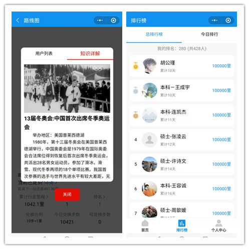 在为期一个月的活动中,会计学院师生每日登录小程序,将“微信运动”记录的行走步数按一定比例兑换成冬奥会圣火传递站点里程数。不断积攒里程数后,按顺序解锁34个省级行政区站点,点燃相应的“奥运圣火”,并学习一个冬奥会小知识,直至完成10万里的总里程数后,到达云徒步的终点站——北京。