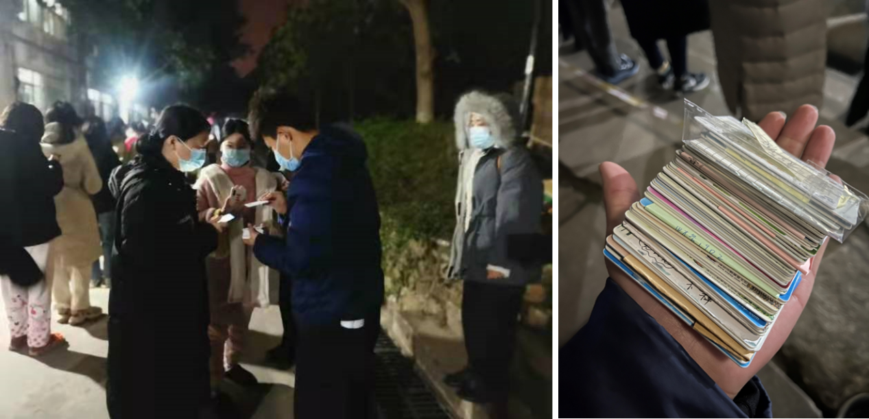 除协助按时分发餐食外,水卡充值是亟待解决的问题之一。隔离当晚,趁着做核酸检测的时候,徐乐老师有序收集需要充值的水卡。一直到晚上十点,在王百一同学的帮助下,才完成全部的充值工作。
