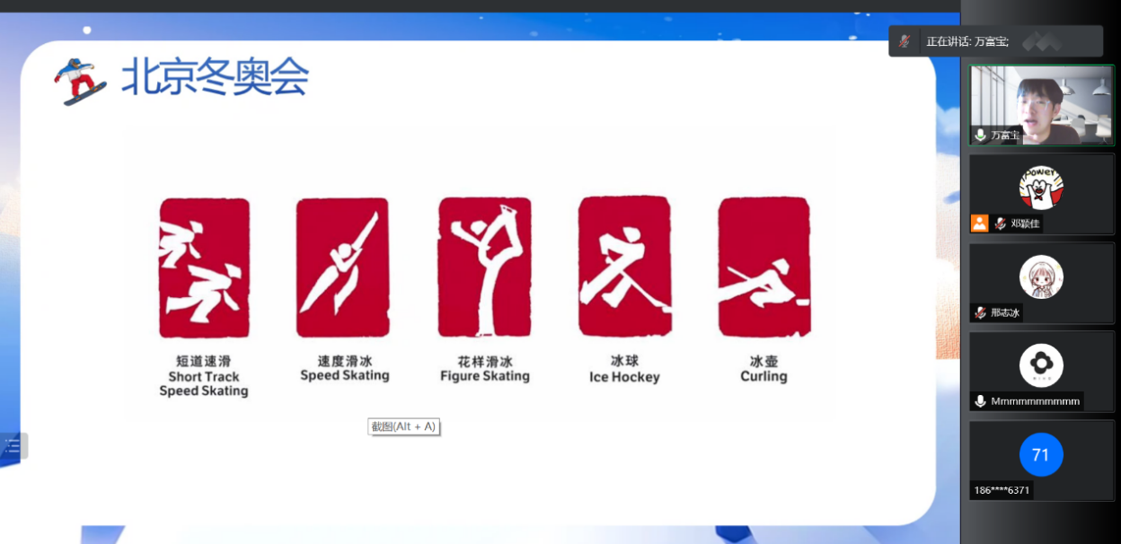 (通讯员 邓颖佳)2022年4月21日下午,通过腾讯会议平台,会计学院学生党员志愿服务团成员为云南省盐津县箭坝小学四年级师生开展以“回味冬奥会,加油向未来”的“云课堂”教学活动,旨在帮助学生了解冬季奥林匹克运动会相关知识,激发学生对冰雪运动的兴趣,培养学生热爱运动、强健体魄的习惯,增强学生的民族自豪感和文化自信。此次课程由学生党员邢志冰和万富宝主讲,箭坝小学校长李勇、四年级班主任万玉凯老师及四年级全体学生参加了本次活动。