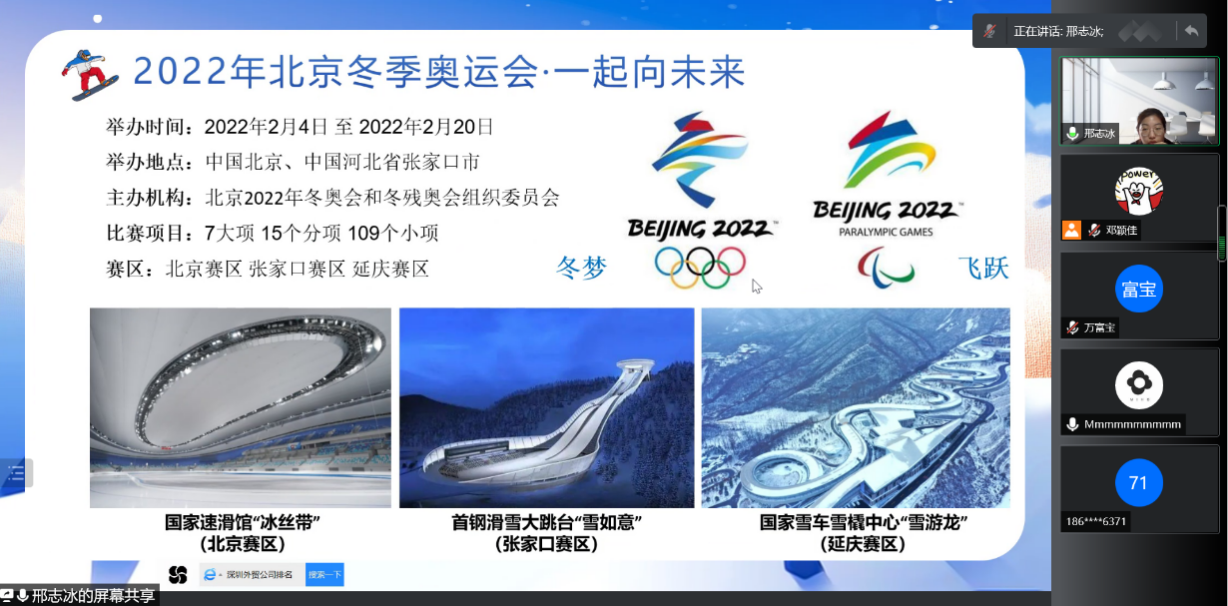 课程开始,邢志冰同志与同学们一起追溯冬奥会的起源。在人类不断追逐自由和超越运动极限的过程中,冬季奥运会诞生,它的诞生为全世界有着相同爱好和梦想的人提供了一座展现风采的冰雪舞台。接着,邢志冰用一段充满欢呼喜悦的北京申冬奥成功的视频点燃了同学们的兴趣,让同学们感受到北京成为世界上首座“双奥之城”的非凡意义。而后,邢志冰向同学们重点介绍了2022年北京冬奥会的基本情况,“冬梦”“飞跃”会徽含义讲解、赛区赛道的图片展示,开幕式中国元素精剪视频……多样丰富的素材让同学们学得津津有味。尤其在介绍冬奥会吉祥物冰墩墩和雪容融时,同学们激动地喊出他们的名字,并与身边的朋友分享自己的感想。邢志冰通过吉祥物名字拆分方法,讲解了冰墩墩象征着纯洁、敦厚、健康,以及雪容融具有洁白、包容、融合的内涵,同学们也知晓了更多“藏在吉祥物身上的秘密”。在最后的知识小测环节,同学们竞相抢答,展示自己所学,课堂气氛十分活跃。