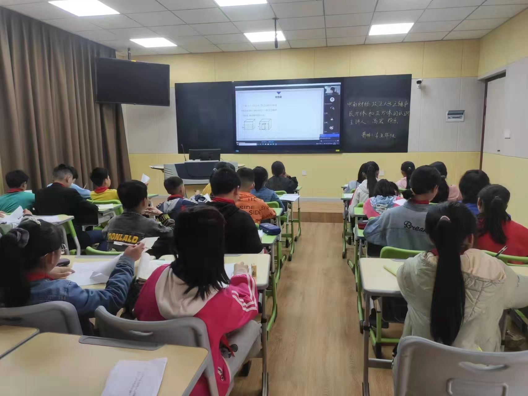 第一部分基础知识的讲解由高宏负责。他以例题为切入点,带领同学们回顾了正方体和长方体的基本性质以及表面积、体积的计算公式。为帮助同学们更好的理解知识点,高宏向同学们展示了生活中常见的长方体,启发同学们要多观察身边的事物,将抽象的数学问题具体化、生活化。在回顾了基础知识后,他为同学们布置了练习题,检验同学们的学习成果。在课堂讨论环节,同学们都积极主动地举手回答问题,与老师和同学分享自己的解题思路和解题方法,课堂气氛十分活跃。