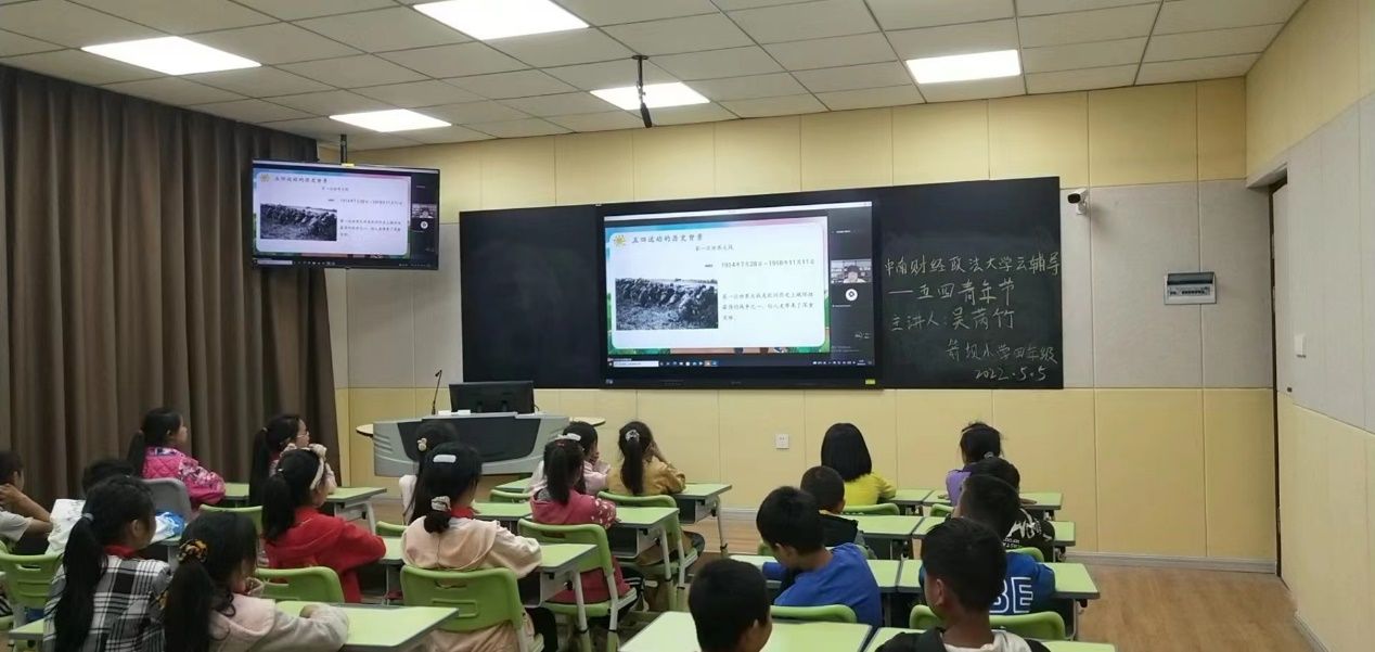 (通讯员 朱洁婷)2022年5月5日下午,通过腾讯会议平台,会计学院学生党员志愿服务团成员为云南省盐津县箭坝小学四年级师生开展了一次关于“五四青年节”的有趣科普小课堂,旨在给小朋友们上一节历史课,帮助小朋友们了解五四运动的历史背景与爆发,认识五四青年节与五四精神,铭记历史、展望未来。此次课程由吴芮竹主讲,箭坝小学校长李勇、四年级班主任万玉凯老师及四年级全体学生参加了本次活动。