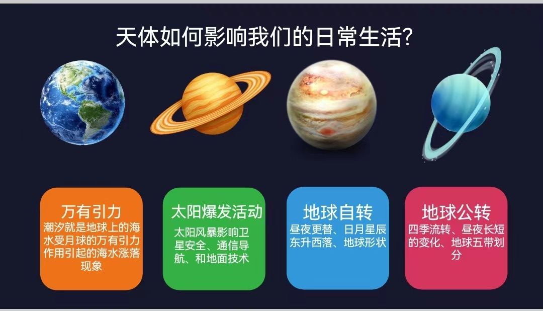 在课堂引入环节,吕艳蓉同志从最为同学们所熟知的“宇宙”一词切入。她对同学们介绍道:“宇宙非常非常的庞大,到现在为止可以观测到的宇宙直径约为930亿光年,而太阳系的直径约90亿千米,也就是说尽管太阳系对我们来说大的无法想象,但它对宇宙来说,也不过是一粒尘埃。宇宙:狭义上来讲,宇宙是指地球大气层以外的空间和物质天体。天体呢,就比如说我们太阳系中的太阳、行星、卫星、小行星、彗星、流星,银河系中的恒星、星团、星云,这些都是天体。”通过一个简单有趣的科普视频,同学们对宇宙有了初步的理解。