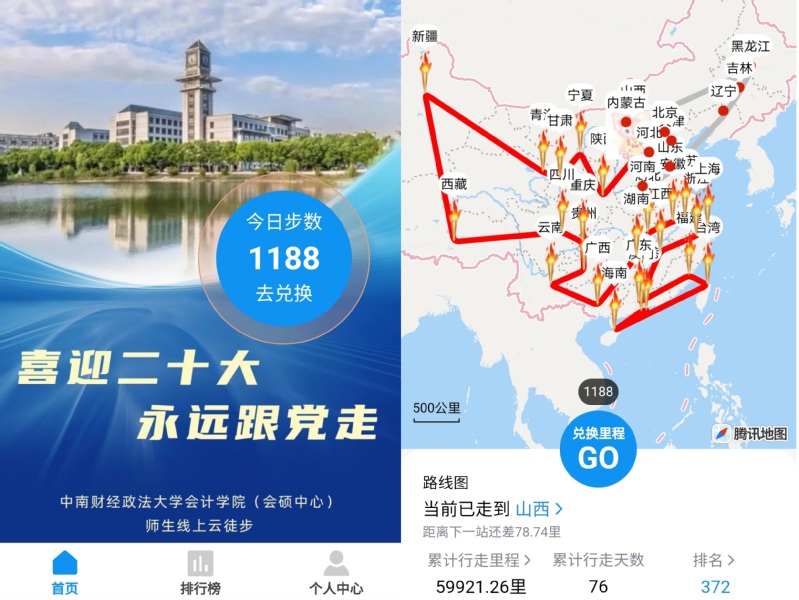 在为期两个月的活动中,会计学院师生每日登录小程序,将“微信运动”记录的行走步数按一定比例兑换成传递站点里程数。不断积攒里程数后,按顺序解锁34个省级行政区站点,直至完成10万里的总里程数。