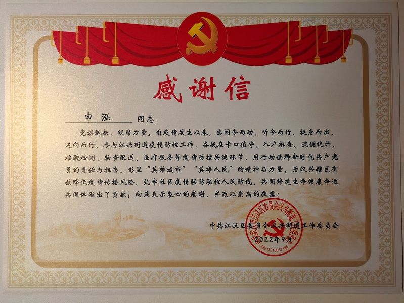 “用行动诠释新时代共产党员的责任与担当,彰显‘英雄城市’‘英雄人民’的精神与力量。“2022年9月15日,会计学院收到了一封来自中共江汉区委员会汉兴街道工作委员会的感谢信,对2021级会计专硕、中共党员申泓同学参与汉兴街道疫情防控工作表示衷心的感谢,致以崇高的敬意。