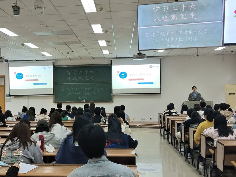 10月27日下午两点,会计学院第二十三届团学志成立大会暨学习二十大·第十六期“青年马克思主义者培养工程”培训班开班仪式于首义校区文泽楼306教室顺利举行。出席本次大会的有会计学院分团委书记陈俊华老师、会计学院2022级本科生辅导员黎玥老师、团学志干部代表以及第十六期“青年马克思主义者培养工程”培训班的新学员。在学习二十大 奋进新征程之际,本次大会旨在学习和弘扬党的二十大精神,并把党的二十大精神贯彻落实到团学志工作的具体实践中。