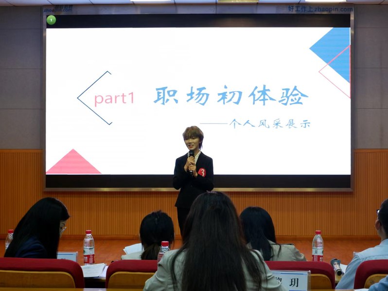 本届比赛共分为职场初体验、职场面对面、职场情境中、职场步步高和职场终选择五个环节。在职场初体验环节中,十二名选手分别上台以快闪视频、ppt展示等多种形式进行精彩的自我介绍,展示了丰富的个人经历与多样的兴趣爱好,充分彰显了个人风采。