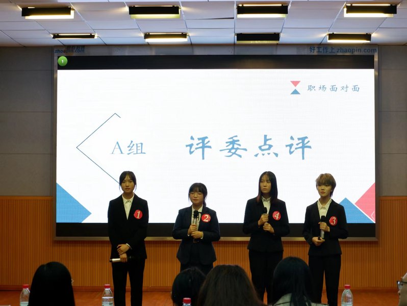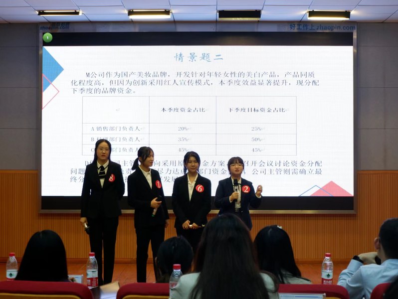 在职场面对面环节中,本届比赛进行了创新,将往届选手模拟商务谈判的形式改成就财经热点进行讨论和案例展示。十二名选手抽签分为三组,共就一个热点进行分析并依次展示成果。选手们沉着冷静、逻辑严密、配合默契,以逐步深化的形式突出观点。面试官们针对选手表现进行提问或点评,选手们给出针对性的回答,呈现出一场精彩的思想盛宴。