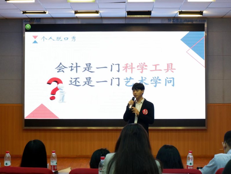 紧接着是职场步步高环节,选手依次上台展示个人脱口秀,他们结合所学的财会知识发表自己看法,幽默而不失严谨。