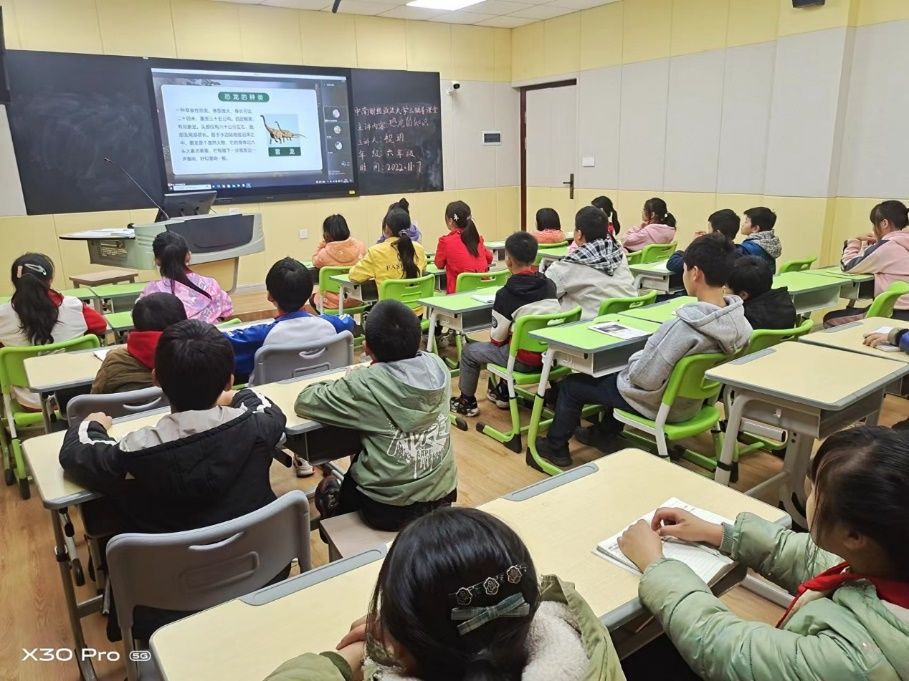 课程开始,祝玥同学与六年级学生们一起学习了恐龙这一名词的由来,并介绍了恐龙的两大类别。接下来,介绍了不同类别中,详细几个具有代表性的恐龙种类,期间穿插几个关于恐龙的科普小视频,将恐龙的形态外观可视化,增加课堂的趣味性,也是同学们印象深刻。第二部分进行了相关的知识拓展学习,简单介绍了上一部分出现的恐龙生活的时期,从而引申出地质年代的划分介绍以及几次生物大灭绝事件。也由此引出第三部分——恐龙的灭绝,其中提到了几个关于恐龙灭绝的假说,也教会了同学们如何科学地识别、汲取不同学术观点结论。最后,让同学们在课后学习交流刚刚所学的、印象深刻的恐龙的种类、特点。整堂课程在同学们意犹未尽的思考回味中圆满结束。