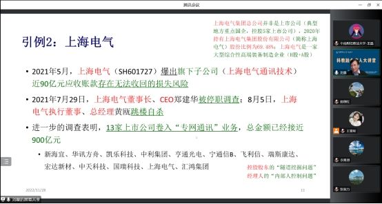在讲座中,刘星教授从中国式现代化与财会审问题研究这一角度作为切入点,提出希冀,鼓励博士生、研究生应该多做一些基于经济学理论和管理学理论的、结合中国背景的会计学基础问题研究,从而引入主题“集团研究与会计问题”。首先,刘星教授提出了以集团企业角度来探讨上市公司的治理与会计问题的必要性,并以“康得新”“上海电气”为基本案例解释了集团公司资金运作关系。