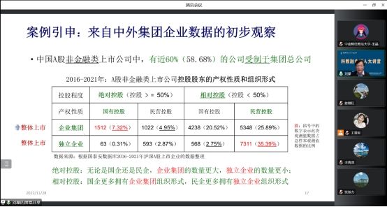 继而刘星教授展示了自己关于中外企业集团比例、国有和民营的企业类型的调研,并且系统介绍了企业集团的主要特点、理论基础、理论解释的局限性以及企业集团的优势和劣势,向学者展示了企业集团的制度环境和治理效果,给听众留下了深刻的思考。