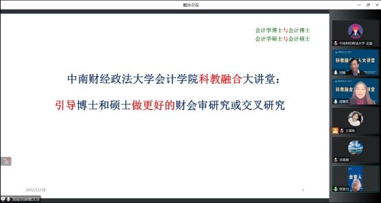 为进一步推动我院研究型人才的培养,通过完善科教融合育人机制,提高学生的综合性学术技能,增进学科各领域之间的联系,2022年11月28日晚上19:00,众学者齐聚一堂,共迎会计学院第七期科教融合育人大讲堂。我院诚挚邀请重庆大学经济与工商管理学院原院长、学术委员会主任刘星教授作为主讲嘉宾,以“公司治理与会计财务”为题,面向会计学院师生作了一场高水平的学术讲座。本场讲座由会计学院院长张敦力和副院长陈丽红教授共同主持,300余名硕博研究生及教师学者参加了本次讲座。